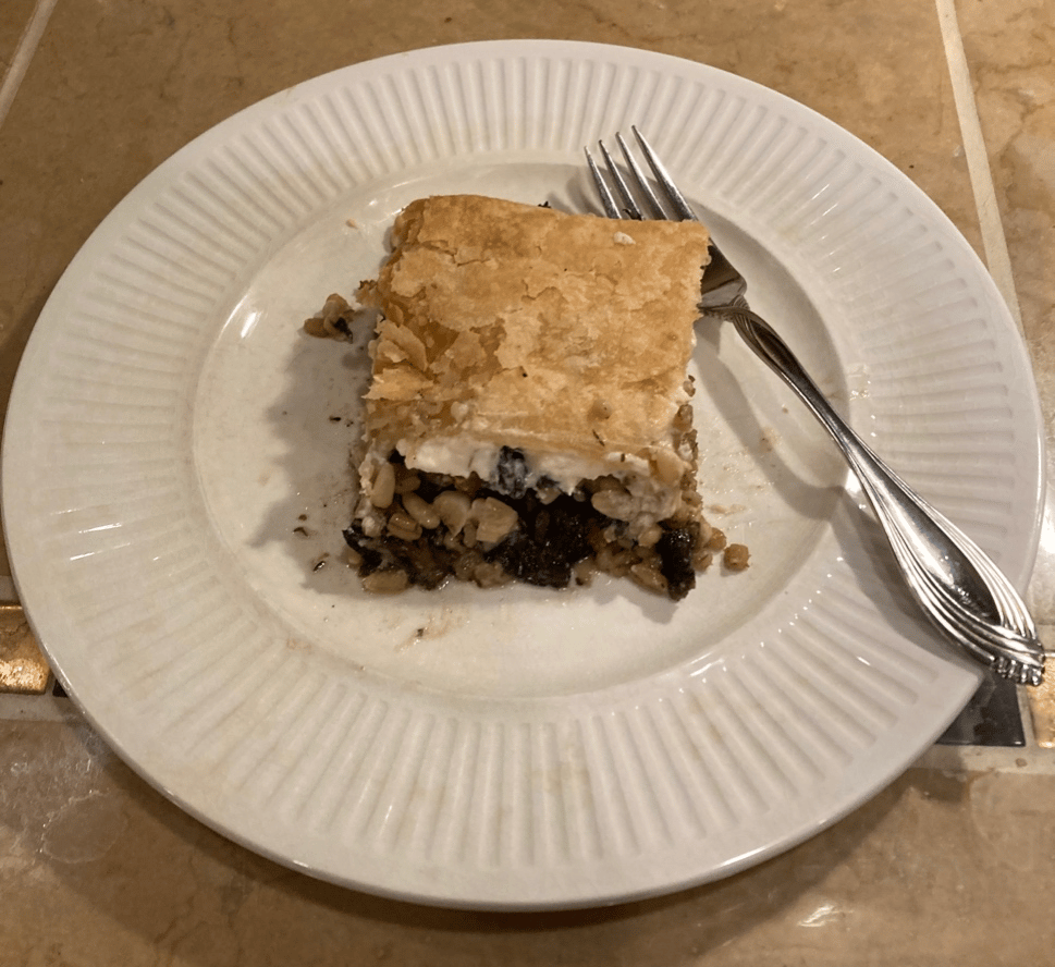 Top with puff pastry and bake: Lay 1 sheet puff pastry, partly thawed according to directions on top of the casserole. We usually find that less thawed pastry puffs better. Bake at 350°F until the pastry puffs up and is golden brown, about 40 minutes.